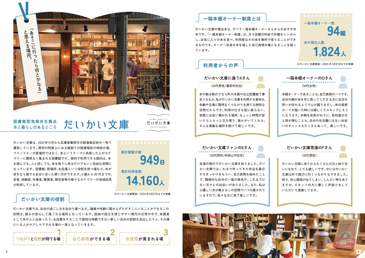 兵庫県豊岡市で運営している図書館型地域共生拠点「だいかい文庫」では、これまでに累計15,000人以上が来館いただきました。孤独や孤立を感じやすい現代の日常の中で、来館者として本や人と出会ったり、お店番をすることで普段は体験できない新しい自分の役割を見出したりと、その場にいる人がケアしケアされる場の一員となっていっています。